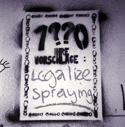 Stencil graffiti(?)Plougher PowerBasel City TheatreBasel, Switzerland1989destroyed [german] translates: «1??0 Your proposals:» and somebody wrote underneath: «Legalize Spraying»